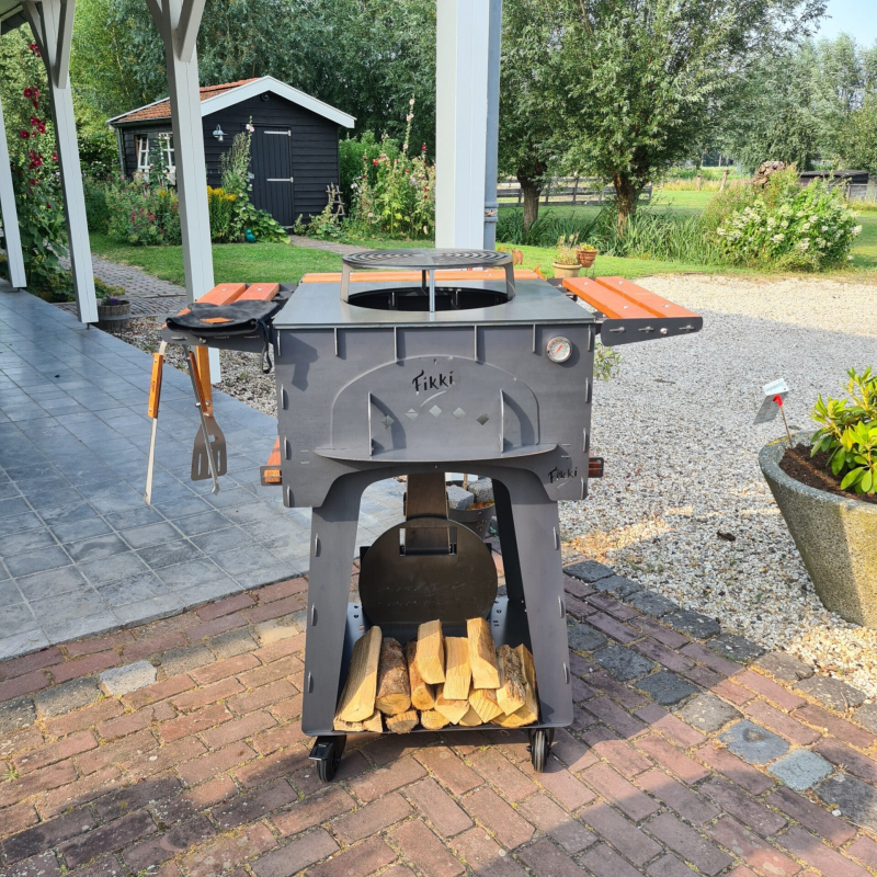 De Fikki Level de Luxe stook je op de stenen bodem, waardoor de grillplaat opwarmt om op te bakken. Maar schuif je het houtvuur naar achteren, opzij, of leg het in het cortenstalen houtrek, dan is de stenen bodem vrij om pizza’s te bakken – een echte pizzaoven! Maar ook een echte grillring!
