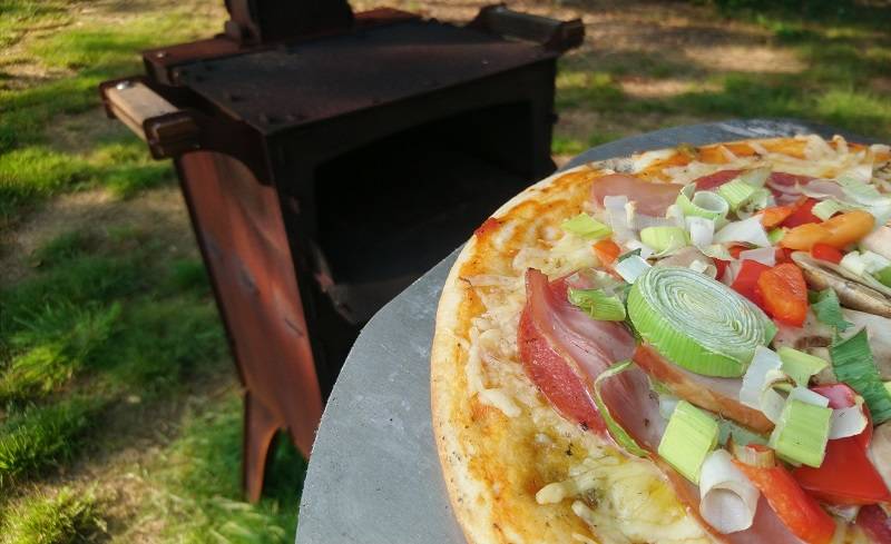 De Fikki Outdoor Oven is al warm opgestookt met hout, zodra het vuur in de oven niet meer al te hard brandt, is het tijd om de pizza erin te schuiven. De bodem plakt niet aan de pizzaschep, dit kun je voorkomen door wat bloem op de pizzaschep te strooien, zodat hij er lekker af glijdt. Na twee minuten de pizza er weer even uitgehaald om te controleren of alles goed gaat. De pizzabodem bakt mooi bruin, het deeg rijst zelfs nog iets onder het bakken waardoor de bodem luchtig wordt. Daarna de pizza weer terug geschoven, nog ongeveer 3 minuten laten bakken in de oven. Met de luchtschuiven kan de temperatuur in oven geregeld worden. Dus geen aangebrande pizza, de pizza is goed gebakken.