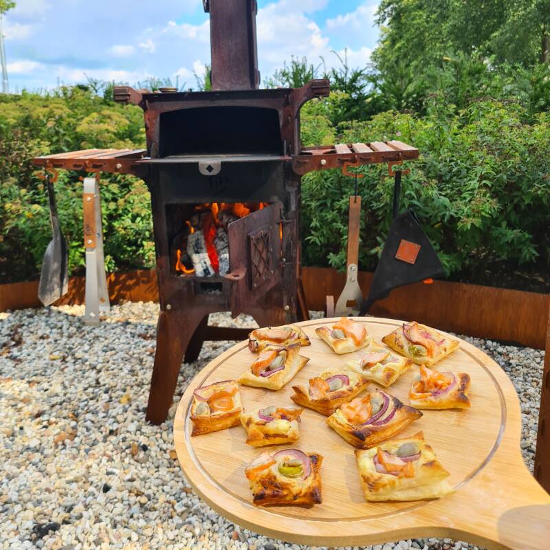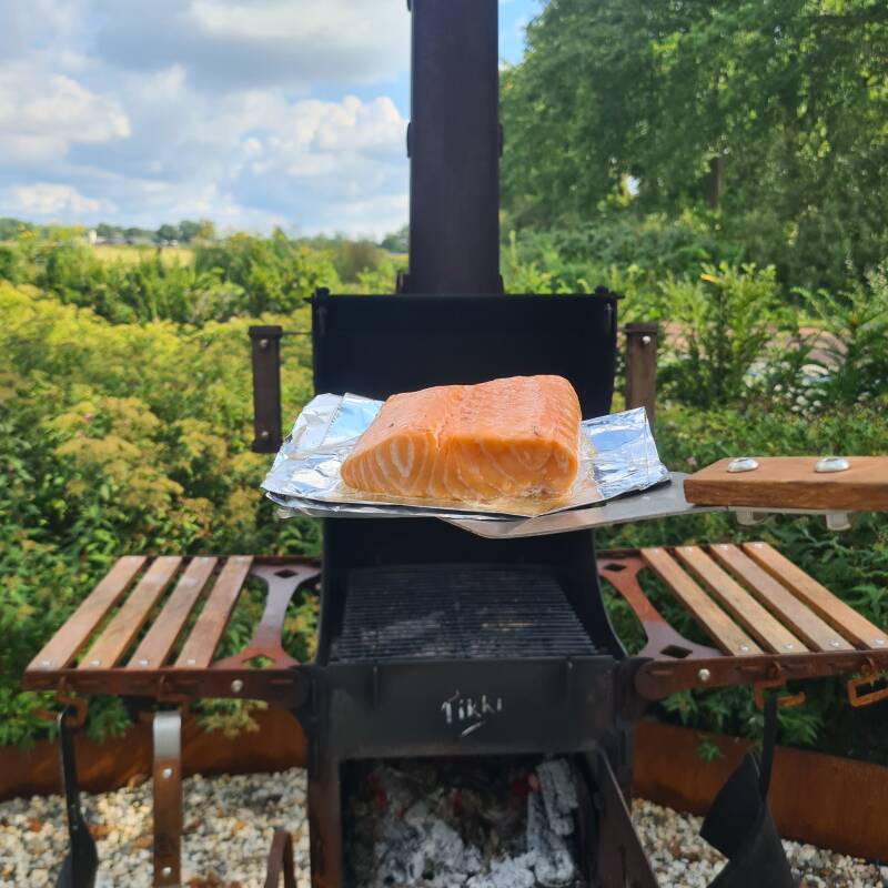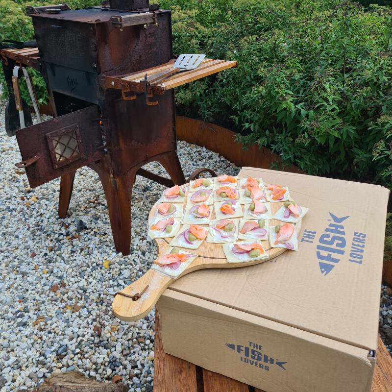 Stook de Fikki Outdoor Oven rustig op met hout onderin, de temperatuur zal dan boven oplopen naar 150 graden, ideaal om de moot zalm te roken. Leg deze in een aluminium bakje of op een stukje aluminium folie. Na 15 minuten is hij voldoende gaar om verder te gaan met de toastjes.