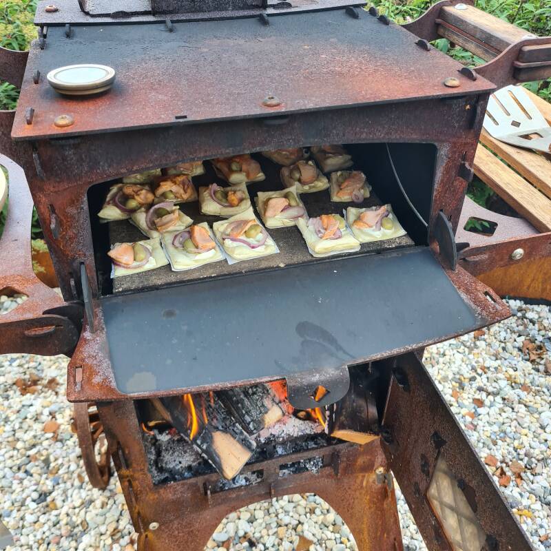 Door de bovenste schuifje dicht te doen gaat alle hitte er aan de voorkant uit waardoor de toastjes goed gaar worden. De pizzasteen is ondertussen flink opgewarmd, nu kunnen de bladerdeeg toastjes erop gelegd worden.